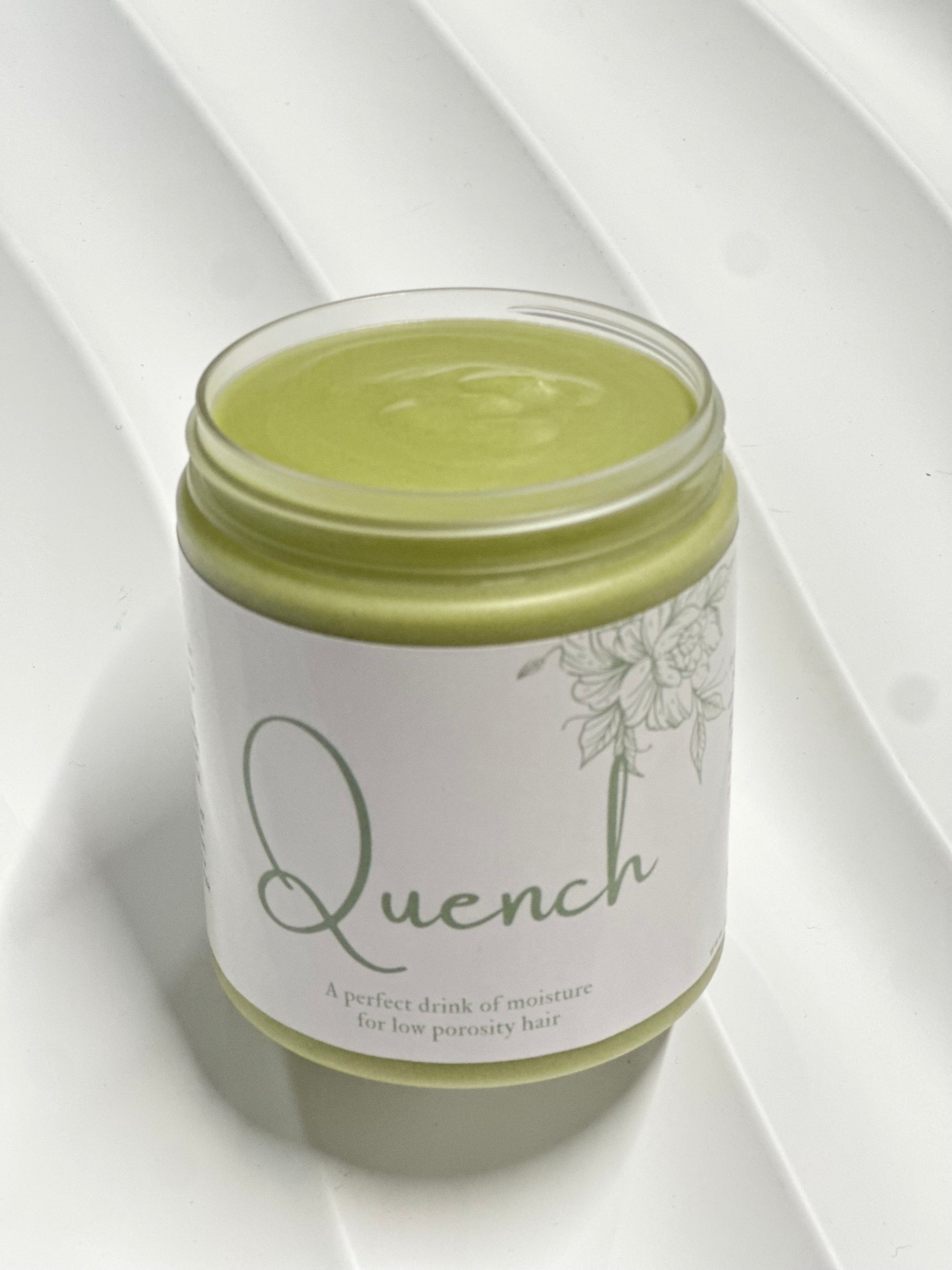 Our Quench Hair Butter is a luxurious, whipped blend created specifically for low-porosity hair, which often struggles to absorb and retain moisture. This lightweight yet intensely hydrating formula combines the softening power of shea and cupuacu butters with a carefully balanced oil blend of avocado, jojoba, baobab, argan, and the soothing hydration of aloe vera juice. Finished with moringa extract for a nutrient boost, this butter deeply penetrates the hair shaft without sitting on top or leaving buildup.